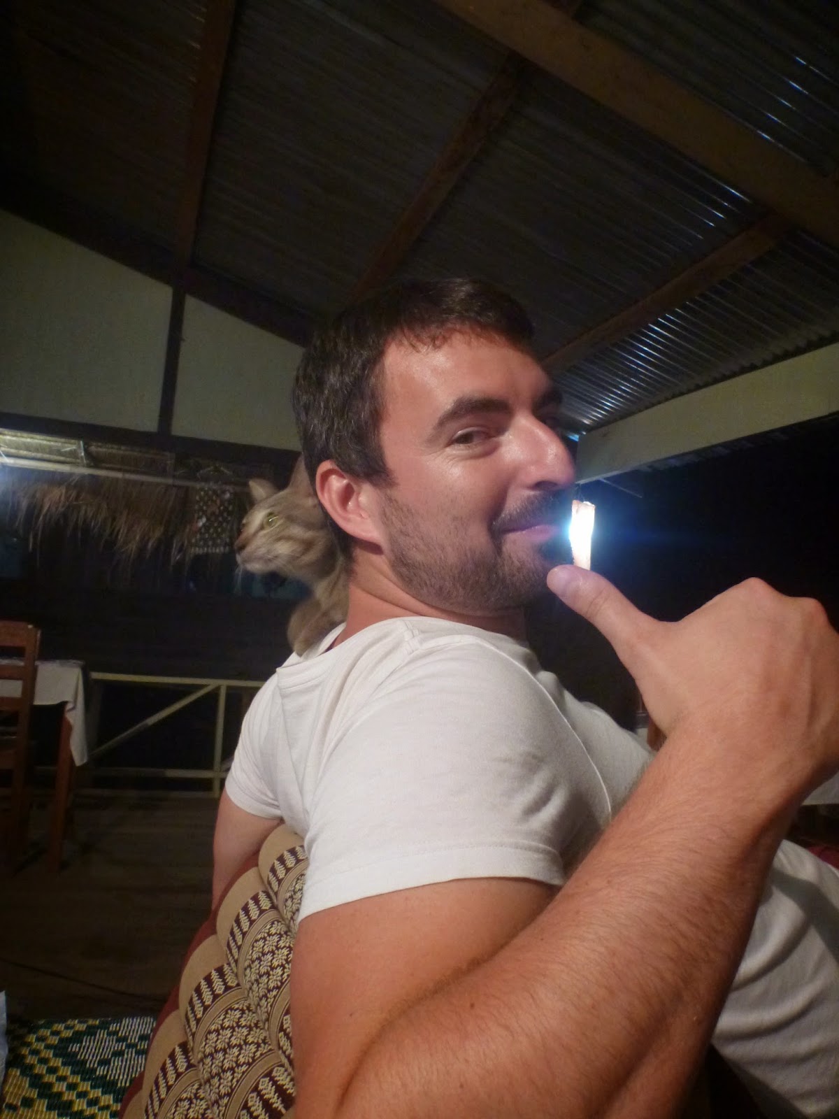 By this point we'd picked up this guy (whose neck sweat and shoulder are a cat's best friend) and we waited around whilst the guesthouse owner grabbed the keys to open up her bungalows.
